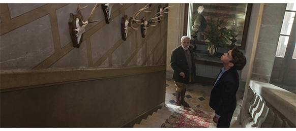 一方、夫から、「これからは、ずっと一緒にいろ」と言われたセレスティーヌは、ポールを城に連れて来ている。廊下を通りながら、窓の外を見ていたポールは、女性が馬に乗って城から出て行くのを見て、「伯爵の娘さん、乗馬がとても上手だね」とセレスティーヌに言う。「何 言ってるの? 娘さんは亡くなったのよ。伯爵に会っても、娘さんのことは話しちゃダメ。絶対よ。すごく悲しいことなの。分かった?」と注意する。1人になったポールが、先日と同じ “階段の壁に飾られた鹿の角” を見ていると、今度は下から伯爵が現われて、「やあ」と声をかける。ポールが引きつったように驚くと、「怖がらせたかな?」と訊く。「はい、ムッシュー。少し」。「鹿の角を見てるのかね?」。するとポールは、見ていた角について、「“12の角”( douze cors)〔12本の枝角のある雄鹿の角〕で、“シュロンドリエ”(surandouiller)〔根元から2つ目の枝角〕は真っ黒です」と話す。伯爵は、驚いて、「12の角? シュロンドリエ? 誰から教わったんだね?」と訊く。「ボレルです、ムッシュー」。「これは素晴らしい12の角だよ。わしらに 大変な思いをさせた。鹿は、”賢い入れ替え” (tapé au change) 後に、姿を消したんだ」。「賢い入れ替えって、どういう意味ですか?」。「鹿の策略なんだ。鹿は他の動物を蹴って犬の群れを惑わし、自分の足跡を見失わせる。わしらは、それを何とか乗り越えた」。その時、伯爵とポールが話しているのに気付いたセレスティーヌが、「ポール、来なさい」と言うが、伯爵は、「いいよ、セレスティーヌ。わしは楽しんどる」と答え、ポールには、「狩猟や動物に そんなに興味があるのかね?」と尋ねる。「はい、動物なら」。少し話した後、伯爵は、自慢の15の角を見せ、「これまで捕獲された中で最も美しい雄鹿だ」と言う。しかし、ポールは、もっと大きいのを見たばかりなので、「もっと大きいのは ないのですか?」と質問する。「ああ、“巨鹿” がいると言われている」。「巨鹿?」。「17本か18本の枝角があるらしい。わしの領地に足を踏み入れた、高貴で素晴らしい旅人だ。だが、それは伝説に違いない。実際に彼を見た者は誰もいない」。映画のこのシーンは、ここで終わるが、映画のこの後の展開からみて、ポールはこのあと、伯爵に、16本以上の枝角を持つ鹿を見たことを話したに違いない。