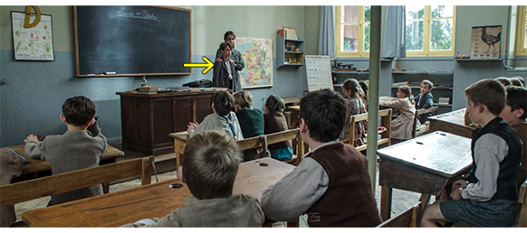 ポールと一緒に城を出たセレスティーヌは、「何を話してたの?」と訊く。ポールは、「狩りと鹿だよ」と答え、「僕、トトシュに会いたい」と言い出す。「ボレルは行かさない。分かってるでしょ」。「ボレルに黙ってたら?」。「学校が始まるから、彼に会う時間もなくなるわ」。「学校?」。「クリスマスまで休みが続くと思ってたの?」。この言葉にポールはびっくりして、笑顔になる。「つまり、僕を家に置いてくれるの?」。そして、学校のシーン。授業の前なので、生徒達は教室の中で遊んでいる。そこに、ドアが開き、ポールと女性教師が入ってくる。教師は生徒達を座らせると、「ポール・ラカサーニュ君です。パリから来た お友だち」と紹介する(1枚目の写真、矢印)。そのあと、授業中のシーンと、ポールが来なくなって寂しそうなトトシュ(2枚目の写真)や、伯爵(3枚目の写真)の姿が交互に映される。