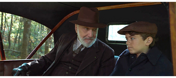 まだ、城や領地についての言及がないので、ベルトランは期待しつつ、「それで、先生… 残りは?」と笑顔で訊く 。告知の場面はここで終わる。次のシーンでは、この城の所有権を失ったベルトランが、車の横に立ち、召使いだったアルマンが、荷物を車に運んでいる(3枚目の写真)。
