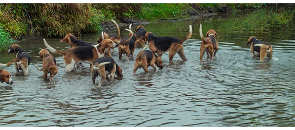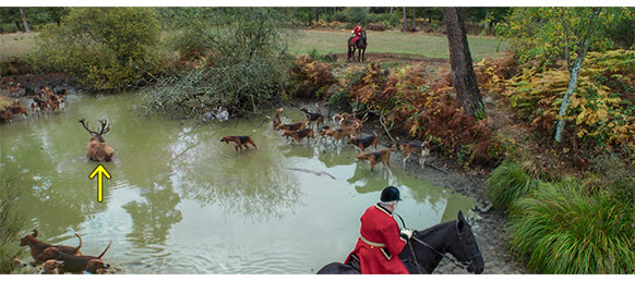 ここで、事態は急展開する。ボレルが巨鹿を捜そうと、一番の狩猟犬を連れて臭跡を嗅がせて森の中を走り回る姿が映る。そして、本格的な鹿狩りの服装に変えると、伯爵に報告に行く。「あの鹿かね? 姿を見たのかね?」。「はい、18の角ではなく、17の角でした。ドルグフェイユの道で、ヴォローヴァン〔狩猟犬の名〕が気付いたんです。あの犬は、決して間違えません。行きましょう」。ボレルは狩りのホルン(コルノ・ダ・カッチャ)を吹き、ヴォローヴァンを先頭に、多数の狩猟犬を全速で走らせる。走る狩猟犬を、走る車から撮影するシーンには、実に迫力がある(1枚目の写真)。そして、巨鹿が逃げて行く(2枚目の写真)。頭のいい巨鹿は、川まで走ると、臭いが付かないよう、川の中を走って行く(3枚目の写真)。