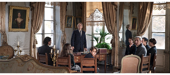 おそらく、その翌日。城館で、伯爵の遺言が告知されるので、楽しみにしながらベルトランが部屋に入って行くと、そこには7人も先客がいたので驚き、公証人に、「そいつら、ここで何してる?」と、生意気に訊く。公証人は、「私が皆さんを呼びました。ド・ラ・フレネ〔伯爵〕様のご指示です。遺言書を読み上げますので、どうぞ おかけ下さい」と言う(1枚目の写真)。仕方なく、8つの椅子の中央にベルトランが座ると、公証人による朗読が始まる。