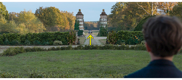 ベルトランが 車に乗ろうとすると、中から出て来たポールが、「待って」と言い、「ぜひまた会いに来て下さい。この領地は 誰でも自由に利用できます」と告げる。ベルトランは、ポールの顔をじっと見ただけで、何も言わない。ここで、アルマンが、「さようなら、ムッシュー・ベルトラン」と言い(1枚目の写真)、彼は車に乗り込む〔この映画では、はっきりしないが、爵位はどうなったのだろう? 普通は、長男の継承が基本原則なのだが… しかし、ベルトランが爵位を継いだのなら、永久の別れの際にムッシューだけでは失礼ではないか?〕。ベルトランの妻(?)はもっと気さくで、セレスティーヌと笑顔で別れの言葉を交わし、そのあと、「私のちっちゃなポール」と言いながら、ポールの頬にキスし、「体に気をつけてね」と言い、ポールも 「さよなら」と言う。ポールは、セレスティーヌと並んで、ベルトラン夫妻の乗った車を見送る(2枚目の写真)。車は、城から離れて行く(3枚目の写真、矢印)。