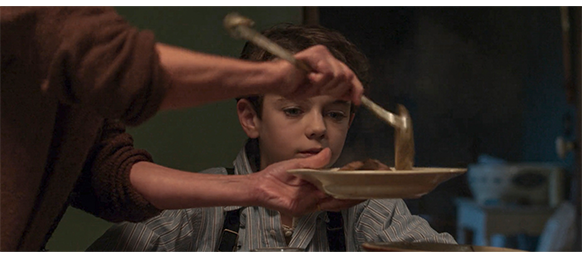 帰宅して、サヤインゲンの両端をちぎり取るのを手伝っているポールに、セレスティーヌは 「あんたを森に行かせたのは、トトシュが一緒だからよ。これは、私たちのちっちゃな秘密。ボレルに知られたら、二度と行けなくなるわ」と話し、「トトシュのこと、好き?」と訊く。それに対し、ポールは、先にトトシュに使った策略を、ここでも使うが、うんとお手柔らか。「そっちも だよね?」(1枚目の写真)。「あのね… ボレル以外は、みんなトトシュが好きなの」。「でも、他の誰より 好きだよね?」。「あんたの質問、イライラするわね」。ここで、ポールは話題を変える。壁に貼られたボレルの小さな額縁入り写真を見て、「ボレルの上の写真は誰?」と訊く。「それ、私の弟のギレック。彼が戦場へ旅立った日よ」。「戻ってきたの?」。「ええ。神様ありがとうございます」。「僕の父さんは戻ってこなかった。死んだらどこに行くの?」。「もちろん天国よ」。「なぜ死んだ人を埋葬するの?」。「生きている人と同じ。死んだ人にも家が要るわ。墓はね、死んだ人の家なの」。「父さんは、軍人墓地に埋葬されてる。一度も会いに行ったことないよ。母さんは、どこに墓があるかも分からない」(2枚目の写真)。