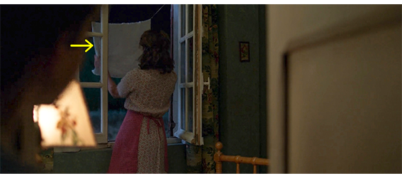夜になり、ポールが洗面台で顔を洗っていると、ボレルが外出の用意をしている。セレスティーヌが、「どこ行くの?」と訊くと、「大きな樫の木の下」と答える。「北風が吹くと、キジが群れをなして枝に止まる。だが、それを知っているのは俺だけじゃない。満月だ、あの野郎も狙いに来るだろう。そしたら、現行犯逮捕して、トトシュを刑務所に入れてやる」と言うと、時計を見る(1枚目の写真)。ボレルが猟銃を持って出かけ、ポールがセレスティーヌにお休みを言おうと、寝室を覗くと、彼女が、窓を開けて白い布を干している(2枚目の写真、矢印)。夜なので理に合わない行動なので、「それって何のため?」と訊く。セレスティーヌは、「ええと… 乾かすためよ」と曖昧に答え、お茶を濁そうと、ポールが川で濡らした服を、「濡れた服、干しておいた」と言って渡す。カメラは、窓に干された布を外から映し、さらに、森の中から出て来た男が、窓から入り、セレスティーヌが布を外す短いシーンを映す。そして、彼女が窓を閉めると、カーテン越しに、2人が立ったまま抱き合う姿が一瞬見える。自分の部屋で本を読んでいたポールは、セレスティーヌの笑い声に気付き、ドアを開けて外を覗く〔何が見えたのかは分からない〕。朝になり、森で一夜を無駄に過ごしたボレルが帰って来て、寝るために寝室に入って行く。セレスティーヌは、ポールにスープと薄切りにしたフランスパンを出し、「トースト食べて」と言う(3枚目の写真)。