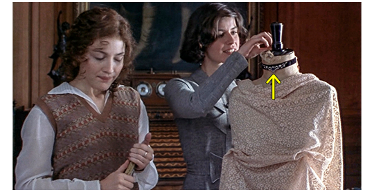 翌日以降。フレイザーがピアノの前で、指で鍵盤を1つずつ叩いて「白鳥」を弾いていると、そこにエロイーズが現われ、「フレイザー、探してたのよ」と言って横のイスに座ると、「サン=サーンス好きなのね」と言って肩を抱く。「うん、エロイーズ伯母さんが弾いた時は」。「誰もいない時は、エロイーズって呼んで」。そう言うと、エロイーズはジャズを弾き始める。しばらくすると、ドアが開き、母が入ってきて、折角の2人だけの時間が終わりになる。母は、音楽の話を始め、エロイーズは2人で合奏することを提案する。結果、母がピアノを弾き、エロイーズはチェロを弾くが、フレイザーはつまらないので(1枚目の写真)、2人に気付かれないよう部屋を出て行く。そのあと、計測係によって、3人の男児が、発育状態を記録するために採寸される場面があり、その部屋には、フレイザーの祖母を先頭に、母、姉、エロイーズがいる。そして、祖母は、夫の母〔フレイザーの曽祖母〕のものだった首飾りをエロイーズに譲る。フレイザーの姉から首飾りを受け取ったエロイーズは、部屋に置いてあったヘッドレスマネキンの首に首飾りを付けてみる(2枚目の写真、矢印)。次の場面は、父による釣り(キャスティング)の練習の場面に変わる(3枚目の写真、矢印)。これは、あまり重要とは言えないが、原作にも書いてある貴重な場面。①芝生の上での練習、②ベートーヴェンの「運命」の「ババババーン」のリズムを口ずさむ父、の2点とも映画は原作をそのまま再現している。①なぜ芝生の上だったのか? AI によれば、アダムにとって、実際の川へ行くことは「本番」であり、そこで不格好なキャスティングをすることは許されないことだった。芝生の上での特訓は、水辺に立つ資格を得るための「儀式」や「基礎訓練」だった。②なぜベートーヴェンだったのか? AI の記述: アダムはキャスティング〔竿の弾力を利用してルアーを狙った場所へ投げる技術〕を単なるスポーツではなく、「物理学と音楽の融合」と考えていた。水辺では魚の気配や流れに気を取られてしまうため、あえて何もない芝生の上で、純粋に「ベートーヴェンのリズム(タイミング)」だけを体に染み込ませようとした。そして、AI は 原作の記述では、この芝生での特訓を経て、彼らは車で少し離れた場所にあるアナン川(River Annan)などの実際の釣り場へ出かけた〔アナン川はフライフィッシング(サケやマス釣り)の聖地だった〕。アナン川は邸宅の西1マイル〔1.6km〕にあり、道もついていた。近距離で徒歩で行ける距離であっても、アダムにとって、愛車ランチア・ラムダに乗り込み、仰々しく「出陣」すること自体が、彼の完璧主義的なルーティンの一部となっていた。