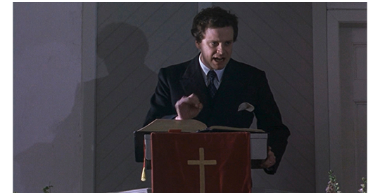 次のシーンは日曜日の礼拝。祖母を筆頭とする一家は、フレイザーの母、伯父、祖母、フレイザー、弟のフィンレー、兄のロロー、姉のエルスペスの順に座っている(1枚目の写真)。説教壇に立った父は、「我らが信仰に対し、いかに誠実に向き合い、いかに雄々しくあるべきか。さて、本日はウィリアム・ブレイクの手による、あの誉れ高き賛美歌の一節を説教の題に引きたいと存じます。『持て来たれ、燃え盛る黄金の弓を。持て来たれ、切なる願いの矢を』…」と話し始める(2枚目の写真)。その真下の脇で、教区牧師のフィンレイソンが、聖書を盾にして、携帯用の酒瓶から酒をチビチビと飲んでいる(3枚目の写真、矢印は酒瓶)。