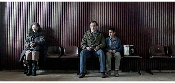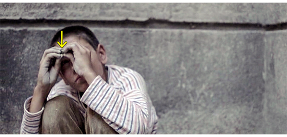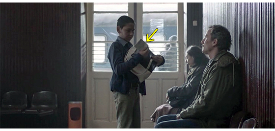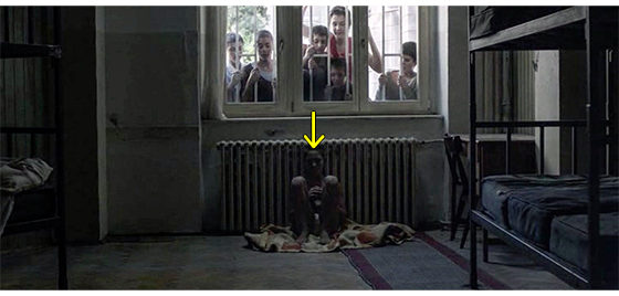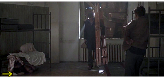 次の場面は、いきなりトラヴニクにある建物の中。プチケは、廊下で呼ばれれるのを待っている(1枚目の写真、矢印)。左下には、「トラヴニク、ボスニア・ヘルツェゴビナ、1992年秋」と表示される〔手紙には、「1992年5月25日正午までに」と書いてあったので、数ヶ月も遅れたことになる。それにしても、なぜ、そんなに遅れたのか? そもそも、そんなに長い間、お金もないのに どこで、どうやって生き延びてきたのか見当もつかない〕。部屋に呼ばれたプチケは、女性職員に手紙を渡し、女性はそれを開いて読む(2枚目の写真、矢印)。そのあとの女性の発言は、全く意味不明。「プチュリツァ。君、ここで何してるの?」。「僕、来たよ」。「どこから来たの?」。「ベオグラードから」〔プチケがトラヴニクに着いたことは、写真の左下の表示で確実。手紙は “プチケにトラヴニクに来い” という内容だった。なら、女性職員は、なぜ「ここで何してるの?」(ロシア語字幕)、あるいは、「どうしてここに来たの?」(英語字幕)と訊いたのだろう? それに、「どこから来たの?」という質問も、ベオグラードの施設宛の手紙を持って来たのだから奇妙だ。「1992年5月25日正午までに」から数ヶ月も遅れたことが影響しているのだろうか?〕。結果として、プチケは 難民収容所に入れられる(3枚目の写真)。