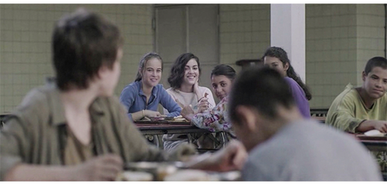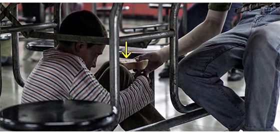 ジカは、プチケと一緒に施設内の食堂に入って行く(1枚目の写真、矢印)。それを見たイルケ〔入口の左脇で食べている〕は驚いたに違いないが、どちらかと言えば嫌がったのは、収容されている少年と少女。ジカが空いたテーブルに1人分のトレイを持って座ると〔プチケは、すぐにテーブルの下に逃げ込む〕、左隣のテーブルに座っていた少女は、テーブルの左端に席を移り、ジカと同じテーブルの真向かいに座っていた少年2人はトレイを持って立ち上がると(2枚目の写真、矢印)、全然違う場所へと移る。ジカは、自分のトレイからパンを1枚取ると、テーブルの下のプチケに、「さあ、プチケ、パンを取れ」と言って突き付ける(3枚目の写真、矢印)。プチケが取らないので、ジカはプチケの顔と膝の間にパンを置く。プチケは、パンの匂いを嗅ぐと食べ始める。それを見ている他の少年たちの顔は、冷やかし半分で、決して好意的ではない。