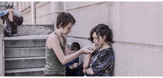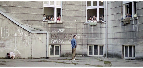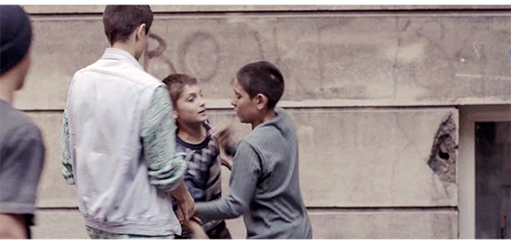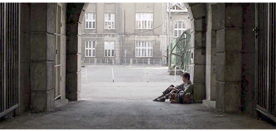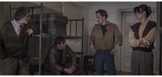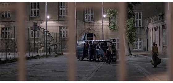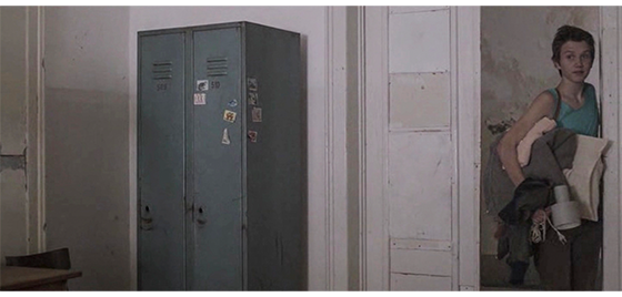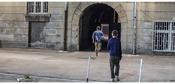 恐らく同じ日、ジカが施設の入口の壁に座り込んでタバコを吸っていると(1枚目の写真)、プチケがやって来て、入口の反対側の壁に同じように座り、じっとジカを見つめる(2枚目の写真)。ジカは、「映画観に行かないか? なんで、そんなバカげたスカーフしてる? お前の好きなトコなら、どこでも行くぞ。47番線〔以下、市営のバス路線〕で街まで行くか、それともバノヴォ・ブルド〔以下、実際にある地名〕まで行くか? それとも、12番線でスラヴェまで行って、そこからノヴィ・ベオグラードまで行くか? それとも55番線でチュカリツァまで行くか?」と、プチケにとって無意味なことを話す。その時、食堂の担当女性が、「夕食ですよ」と呼んだので、外に出ていた少年4名が中に入って行き、プチケも、ジカを何度も振り返りながら走って去る(3枚目の写真)。