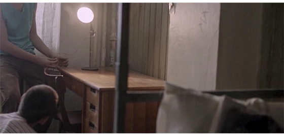 ジカは、今までいた自分の四人部屋の荷物を全部持って、プチケの部屋に入って行く(1枚目の写真)。プチケはびっくりするが、怖がる様子はない。ジカは窓際のテーブルの上に電気スタンドを置くと、二段ベッドの下に荷物を置いて座り、「来いよ、プチケ」と声をかける。そして、カンガルーの形をした “押すとキュっと音のする中空人形” を鳴らしてみせ、プチケに投げ渡す。次に、「これ、カセットだ」と言って渡すと、何か分からないプチケは、カセットを投げてテープを一杯出す。3番目に、ジカは「これ見ろよ」と言うと、電気スタンドを点けて見せる(2枚目の写真)。そして、光の前で指をかざして動かす。4番目に、ジカはプチケに小さな写真帳を渡す。プチケが、中に入っていた写真を見ているので、ジカが取り上げようとすると、プチケは写真を掴んで放そうとせず、奪い合いになる。結局、中に入っていた写真は、床に散乱する(3枚目の写真)。最後に、ジカは二段ベッドの上の段に横になり、「猿め」とあきらめ、プチケは下の段で丸くなる(4枚目の写真)。ジカが眠った後も、プチケは、電気スタンドを点けたり消したりして遊ぶ。