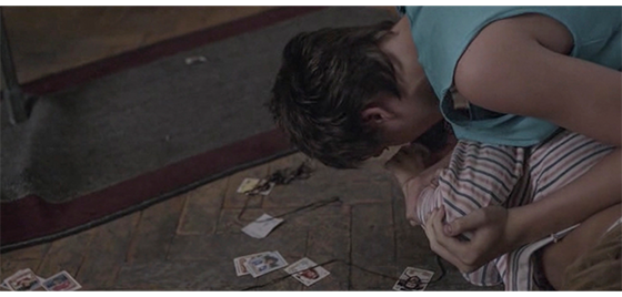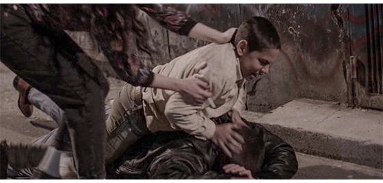 ある日、建物の開口部で、ジカとプチケがじゃれていると、そこに年上の太った不良がやって来て、からかうように 「プチケ、どっから来たんだ?」と訊いたので、ジカは 「ロッキー、あっちに行けよ」と注意する。ロッキーが脅すように、「何の用だ?」と聞いたので、ジカは、「あっち行け、ロッキー」と繰り返す。「何だと?」。「あっち行けって、言ってるんだ」。「何だと?! クソ野郎!」。ロッキーは建物の中に入って来ると、ジカに襲いかかり、頭を掴むと(1枚目の写真)、床に投げ倒し、足で踏みつける。それを見たプチケは、背後からロッキーの背中に乗ると、首に噛み付く(2枚目の写真、矢印)。ロッキーはあまりの痛さに床に倒れ、プチケは自分の部屋に逃げて行き、ジカもすぐに後を追う。そこにイルケが入って来て、「そのガキは危険だ。ここには置いておけん」と言うと、ジカは 「ダメ」と反対する。「ジカ、どくんだ」。「イヤだ! 彼は、僕を守ってくれたんだ! ロッキーが先に始めたんだ!」(3枚目の写真)。「黙るんだ。彼はロッキーを殺したかもしれないんだぞ。彼は何も分かっとらん」。「彼、分かってるよ」。そう反論すると、ジカはプチケに、「プチケ、電気を点けて。電気を点けろ!」と命じる。すると、プチケは電気スタンドを点ける(4枚目の写真)。