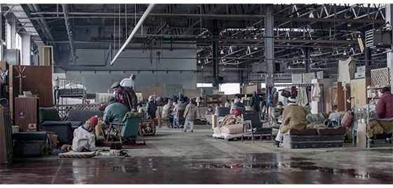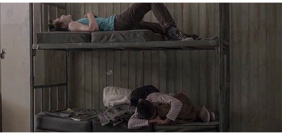 プチケが、それまでずっと一緒だった少年たちに、先程渡された証明書を見せていると(1枚目の写真)、フェンス際に集まった年上の、ボスニアから逃げてきた非イスラム教徒の不良難民たちから、「ムスリム」と、憎しみの声がかかる(2枚目の写真)。プチケが自分の部屋に戻ってみると、ドアが開いたままになっていて、ベッドのマットレスがバラバラに破壊され、中のスプリングが剥き出しになっていた(3枚目の写真)〔さっきの不良難民の仕業〕。