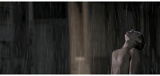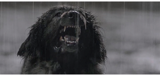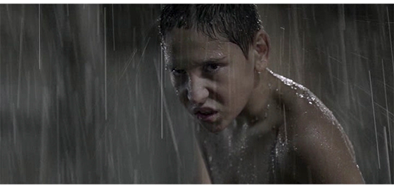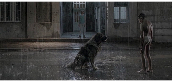 その夜、窓の外から犬の鳴き声がしたので、プチケは窓から雨の降る内庭を見ている。それに気付いたジカは、「どうした、プチケ、寝るんだ」と言う。次のシーンでは、ジカが、プチケのしたいようにさせている。プチケは、以前のようにパンツ1枚になり、雨の降る中を円を描いて走ったり、一ヶ所でくるくる回ったり、空に向かって口を開けて雨を飲んだりする(1枚目の写真)。その後も、雨の中で、恐らく昔やっていたように、自由に楽しむが、大きな犬が近づいて来るのを見ると、立ち止まってじっと犬を見る。心配になったジカが、「こっちに来い」と呼んでも、「逃げろ!」と叫んでも、プチケは犬を睨み続けるだけで動こうとしない(2枚目の写真)。近くまできたロットワイラー犬が 威嚇するように口を開けると(3枚目の写真)、プチケも威嚇する顔に変わる(4枚目の写真)。結果的に、猛犬は、プチケの前におとなしく座り込む(5枚目の写真)。