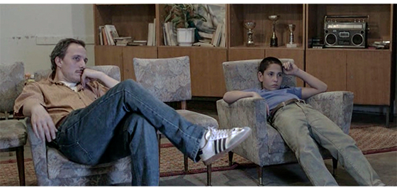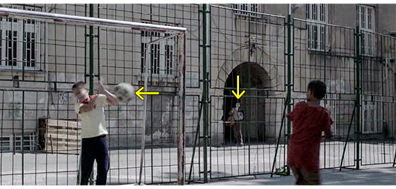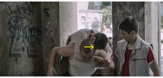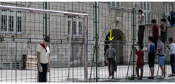 ジカがいなくなってから約1年後、フェンスで囲まれた運動場で少年たちがサッカーをやっている。ゴールに立っているのは何とプチケ。顔に向かって飛んできたボールを、プチケは両手で跳ねのけるが、ちょうどその時、施設の入口〔ここまでは、誰でも入ることができる〕から、久し振りにジカが現われる(1枚目の写真、矢印はボールとジカ)。見事なブロックに、「すごいぞ、プチケ!」の声が上がる。その直後、「おい、見ろよ、ジカだ!」の声も。それを聞いたプチケは振り返ってジカを見る。しかし、他の少年たちがフェンスに張り付いて、「親爺に、また追い出されたんか?」。「殴られた?」と訊くが、プチケは下を向いたままでジカを見ようとしない(2枚目の写真、矢印)。フェンスの前まで来たジカは、少年たちの質問を無視し、プチケに向かって 「プチケ、来いよ」と笑顔で言う。しかし、プチケはチラとジカを見て、また下を見る。ジカは、「お前、大きくなったな」と、再度、声をかける。他の少年が、「あいつ、話すようになったぞ」とジカに教える。それを聞いたジカが 「何か、言えよ」と言い、プチケも何か言おうとするが、そこに、事態に気付いたイルケがやって来て、「全員、すぐ中に入れ!」と命じる。プチケが動かないので、「君もだ、プチケ。中に入りなさい」と指示する。そのあと、イルケは一旦中に入り〔運動場のフェンスから外には出られない〕、フェンスの外まで戻ってきて、ジカと並んで座る。「それで? どうした?」。返事はない。「警告しただろ。なぜ聞かなかった?」。返事はない。「働かされた。で、“仕事がなくなったから、追い出された”、だな?」〔ここは映画の設定。一番詳細なクロアチアの映画解説サイト(FILOVI/hr :https://www.filmovi.hr/index.php?p=article&id=2250)では、「父親の失敗とジカの世話ができなかったことが原因」と書かれている〕。ジカは、「クソ親父」と一言。イルケ:「もう、ここには戻れない、分かってるな?」。ジカ:「そりゃいいね。こんなクソみたいなトコ、二度と戻りたくない」。そのひどい言葉に、“心配してやって損した” と思ったイルケは、何も言わずに立ち去る。