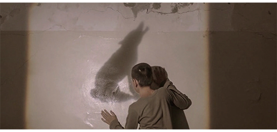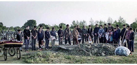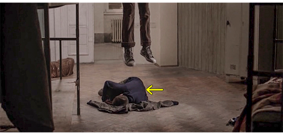 翌日、施設の入口よりは少し中に入った壁に、ジカとプチケが並んで座っている。そして、夕食の時間に、今度はイルケがプチケを呼びに来る。プチケが立ってイルケの方に歩いて行くと、今度はジカが 「プチケ」と呼んだので、プチケは立ち止まる。ジカは、もう一度 「プチケ」と呼び、その直後に、今度はイルケが 「プチケ」と呼ぶ。プチケは、イルケの方に歩いて行く。ジカが3度目に 「プチケ」と呼ぶが無視され、4度目も無視される。実は、イルケの目的はプチケの食事ではなく、“ジカが隠れて寝る場所” をプチケに手伝わせて作るためだった。イルケは、プチケの部屋に入って行くと、使わないベッドの正方形のマットレス3個〔3個を縦に並べてベッドにしてある〕を2人で持ち(1枚目の写真、矢印はマットレス)、地下室のような場所に並べると、「ジカを呼びに行こう」と言う。しかし、さっきまでジカがいた “施設の入口” に戻ると、そこには誰もいない。イルケは走って外まで見に行くが(2枚目の写真)、そこにも姿はない。そのあと、プチケは、施設の子供たちとTV(?)〔映像では、音楽が流れ、笑顔で何かを観ている子供たちだけが映る〕を楽しそうに観る。観終わったプチケが笑顔で廊下を歩いて自分の部屋まで行くと、ドアが開いていて、中を見たプチケは呆然とする(3枚目の写真)。次のシーンでは、首吊り自殺したジカの脚の下でプチケが丸くなっている(4枚目の写真、矢印)【実話と大きく違う。冒頭のインタビュー記事では、「数年前に旅に出て二度と戻らなかったŽika」と書いてあった】。ジカについての最後のシーンは、ジカの最悪の父も参列して行われた施設主催の土葬による埋葬式(5枚目の写真)。なぜか、アリッサが笑い出すが、自分を捨てたことへの当てつけか、泣き笑いなのか?