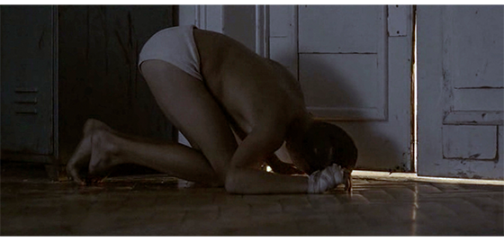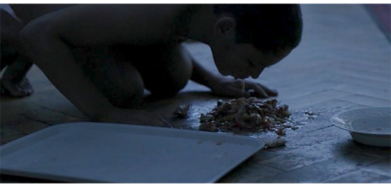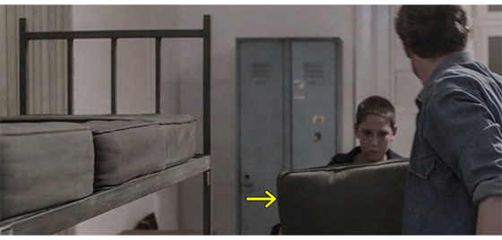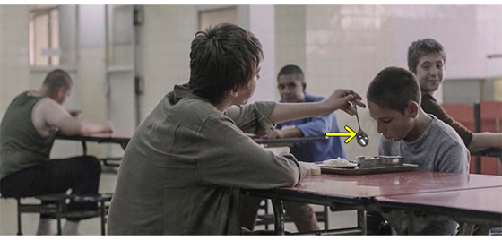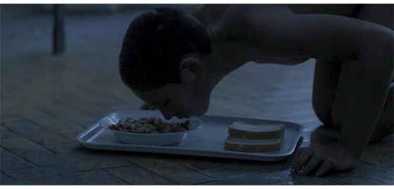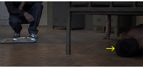 ハリスは、施設に収容される少年用の4人部屋の一つに入れられる〔2段ベッドが2つ、2人用のロッカーが2つある〕。麻酔が切れて意識を取り戻したハリスは、2段ベッドの下に丸まって隠れている。そこに、指導員のイルケが入って来て、床にパンと料理の入った皿を載せたトレイを置く(1枚目の写真、矢印はハリス)。イルケがいる間は、ベッドの下で動かずにいたハリスだったが、彼が部屋を出て行くと、ベッドの下から出てきてトレイをじっと見つめ、料理の入った皿、パンの順に鼻で匂いを嗅ぐ(2枚目の写真)。そして、パンを手で払い除けると、今度は、料理の皿を床に出して、ひっくり返し、裏返った皿を捨てると、床に落ちた “料理された食べ物” を食べ始める(3枚目の写真)。