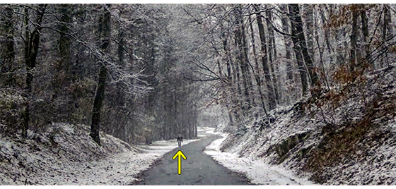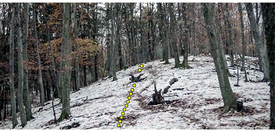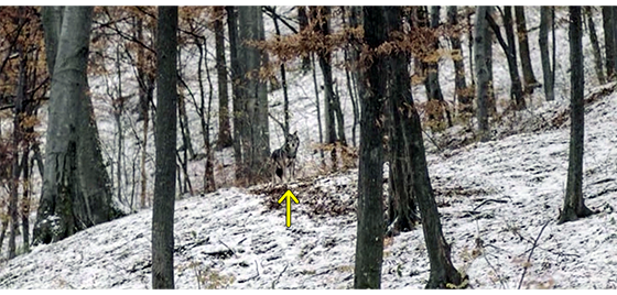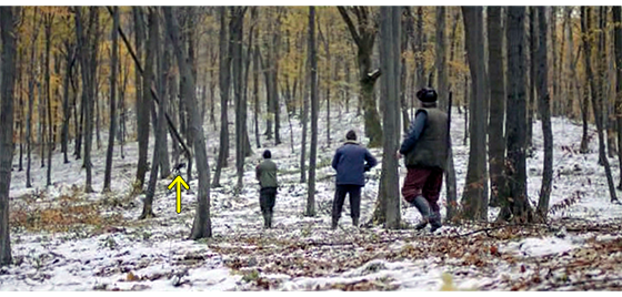 しかし、こうした行為に耐えられなくなったプチケは、ある夜、廃棄された建物に隠れた小隊が眠ったのを見極め、こっそりと逃げ出す(1枚目の写真)。そして、雪山を走って登り(2枚目の写真、矢印)、森の中に消えていく。翌朝、誰もいない静かな森の中で、プチケは、木の幹に寄りかかると、戦闘用長靴を捨て、靴下だけになる(3枚目の写真、矢印)。その後、木のない雪の斜面を登っては、何度も転がり落ちて遊び、森と親しむ(4枚目の写真、点線は転がる場所)。最後に転がり落ちた時、久し振りに生きたオオカミ(矢印)がいたので、プチケはそのままじっとオオカミを見つめる(5・6枚目の写真)〔悲劇的な死の可能性の高い実話だが、映画では、希望を持たせている。しかし、このまま、再びオオカミ少年に戻ってしまうのも、望ましい結末とは言えないのでは…〕。
