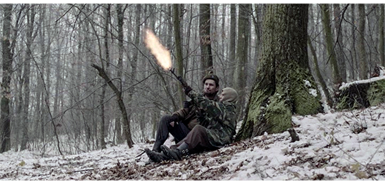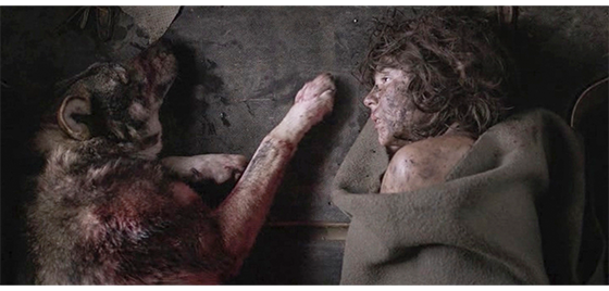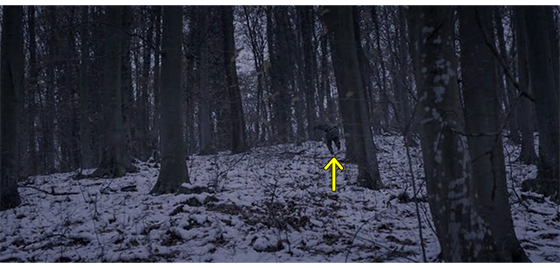 雪の森の中を、狩人3名が歩き回り、1人がオオカミ1匹を撃ち殺す。3人は遠くの方で、自分たちをじっと見ているオオカミに気付く(1枚目の写真、矢印)。オオカミはさっと逃げて行き、3人はオオカミを追って森の中を走る。すると、先行した2人が何か別のものの存在に気付き、先頭を走っていた男が、叫び声を上げる裸の子供を抱えている映像に変わる。2番目の男がすぐに追いつき、暴れる子供を2人がかりで抑え込む(2枚目の写真)。ここで、カメラは切り替わり、狩人のSUVの後部に乗せられた少年と死んだオオカミが写る(3枚目の写真)。