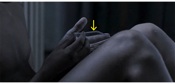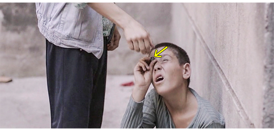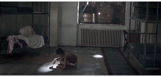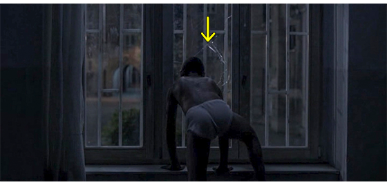ハリスの情報が、どの程度他の少年たちに伝わったのかは分からないが、ハリスの入っている部屋〔2階〕の窓には、多くの少年がよじ登って来て中を覗いている(1枚目の写真、矢印はハリス)〔窓の真下のラジエーターにぴったり身を寄せているハリスの姿が、格子の入った窓から見えるかどうかは微妙/春なのでラジエーターは切ってあるから、くっついていても火傷しないのだろうが、パンツ1枚で寒くないのは、雪の中でも全裸で平気だったからであろう〕。暗くなって誰もいなくなると、ハリスは頭で窓ガラスを割る(2枚目の写真、矢印)〔なぜ、割ったのかは分からない。そもそも、ガラス窓は初めてなので、頭で割れるとなぜ分かったのだろう?〕。ハリスは、部屋に落ちたガラスの破片を拾ってきて、珍しいので手に取っ手遊ぶ(3枚目の写真、矢印)。ガラスを通して眺めた後、破片を手でぎゅっと握ってしまい、左手から血が流れ出たので何度も何度も舐める〔森でケガした時には、いつも舐めていたのであろう/唾液内には ばい菌に対し, 抗菌や殺菌作用のある分泌型免疫グロブリンや殺菌性酵素が含まれているので、これまで何とか生きてきた〕。次のシーンは、翌朝。大工(or 雑用係)が来て、イルケの指示で、二度とガラスを割らないよう、ガラスをすべて外し、代わりに 木の板を窓一面に張り付けた(4枚目の写真、矢印は、包帯を巻き付けた左手の傷)。