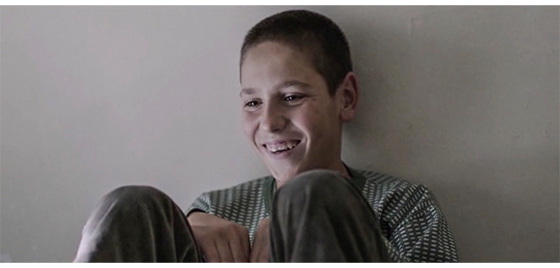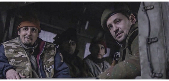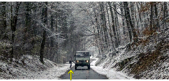 そして、次なる大きな謎。プチケは、難民収容所から逃げ出し、何の説明もなく、森の中の道を一人で歩いている(1枚目の写真、矢印)〔プチケのことを監督に話したDragan Rolovićは、施設内の出来事は話せても、ボスニアに返還された後のことは全く知らない。従って、監督もどうしていいか分からない。それにしても、もう少し、納得のいく脚本にして欲しかった〕。すると、そこにボスニア軍の小隊を乗せた1台のジープがやって来て、プチケの前で停まる。中にいたボスが、「どこに行くんだ、チビ君? どっちの側〔ボスニアか敵〕か? 名前は?」と訊くと、ようやく 「プチケ」と答える。「おいおい、そんなの名前じゃない。名前を言うんだ」。「ハリス」。「ハリス? なら、君は俺たちの仲間だ。乗れよ」(2枚目の写真)。プチケは、逆らわずにジープに乗る(3枚目の写真、矢印)。