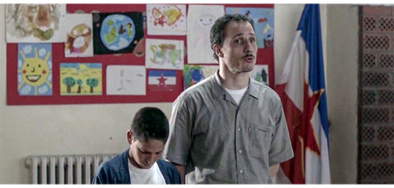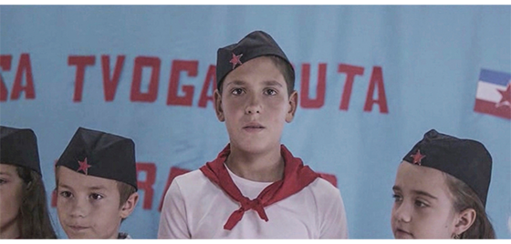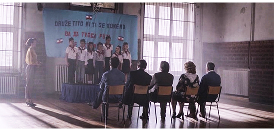 プチケは、施設内の学校に連れて行かれ、教師と一緒に黒板の前に立つと、「皆さん、新入生のハリス君です。温かく迎えてあげましょう」と紹介される。生徒たちから一斉に拍手が起きる(1枚目の写真)〔これまで、節目ごとに何年と表示されてきたのに、なぜ省いたのだろう。1989年秋まで来て、クリスマスも過ぎているので、1990年の春か秋であろう〕。プチケは、一番前の机に座らされる。クラスでのシーンは短く、次のシーンは、ユーゴスラビア・ピオネール連合〔共産主義青年同盟の下部組織〕の、小学1年生7人を対象にした入団式〔秋に各学校で開催〕。全員が赤いスカーフ(マラマ)と、★を点けた紺色の帽子(チトフカ)、白いシャツを着ている。そして、来賓と施設の一部職員を前にして、「私はピオネール〔パイオニア〕となるにあたり誓います。私は勉学に励み、勤勉に働き、両親や年長者を敬い、約束を守る誠実で真摯な友人となり、祖国ユーゴスラビア社会主義連邦共和国を愛し、自由と平和を求める世界中のすべての人々を大切にします」と早口で言う(2・3枚目の写真、プチケは立っているだけ)。なお、子供たちの後ろの青い幕には、紺色の字で 「同志ティトー、私たちは あなたに誓います」と書いてある〔ティトー、あるいは、チトー大統領は1980年5月4日に死亡しているので、死後10年経っても “独裁者としてのカリスマ” を維持している〕。