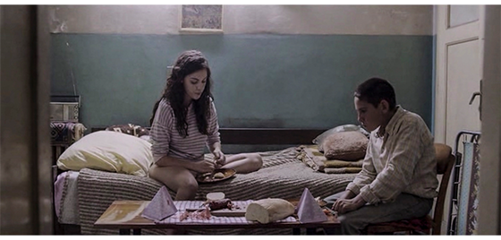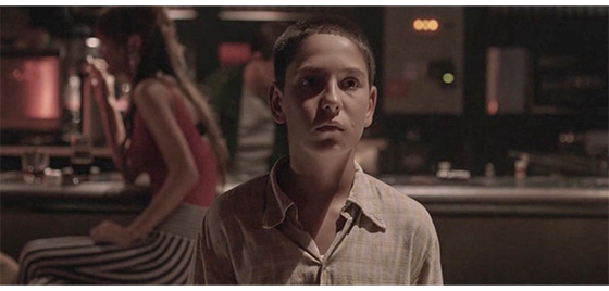 次のシーンでは、プチケが、ボタンの付いたシャツを着ようとして、ボタンをかける穴を一つ間違えたので、一番下で数が合わなくなって戸惑う(1枚目の写真)。ボタンをかけ直してプチケが向かった先は、汚い裏町にある「KLUB(クラブ)」〔Bの字が剥がれて落ちかけている〕。ドアの上には、女性の踊る脚の絵が左右に2人分ずつ描かれ、真ん中に店名が書いてある〔プチケのような子供が入る場所ではない〕。守衛などいないので、プチケは中に入って行く。プチケは、バーカウンターの前を通って奥に進むと、店の中央に円形の壇があり周囲に簾(すだれ)が床まで下がっている。その中では、ビキニ姿の女性3人が腰を振って踊っている。プチケは、それをじっと見ている(2・3枚目の写真)。3枚目の写真の矢印の女性は、施設を卒業した後のアリッサだと後で分かる〔これも映画のみの設定。先に紹介したクロアチアの映画解説サイト(FILOVI/hr)には、「この映画には、女性も登場し、孤児院で育った少女の避けられない運命が象徴的に示される。ジカの恋人アリッサは、ナイトクラブから、必然的に売春へと悪循環に陥っていく」と書かれている〕。踊っている最中にプチケに見られていることに気付いたアリッサは、仕事が終わると、店の中にある自分の部屋にプチケを連れて行く。アリッサは、「居たければここにいてもいいよ」と言うと、棚からタオルを取り出し、「座ってて。シャワーを浴びてくるから」と言って、シャワーを浴びに行く。一人になったプチケは、棚に貼ってある3枚の連続写真〔遊園地にあった写真ボックスで、ジカ、アリッサ、プチケを一緒に撮ったもの〕を見ている。シャワー室と、プチケのいる部屋の間には簾しかないので、アリッサの裸も透けて見える。そのあと、2人は、栄養バランスの悪い夕食を一緒に食べる(4枚目の写真)。アリッサが、「彼女できた?」と訊くと、プチケは分からないくらい小さく首を横に振る。食べ終わると、アリッサは別のタオルをプチケの横に置き、「シャワーに行って」と言う。プチケは、狭い洗面兼シャワー室で体を洗うと、何とか間違えずにボタンをはめる。すると、小さな窓のすぐ前を長い列車がゴトゴトと大きな音を立てて走って行く〔最悪の居住環境〕。アリッサとプチケは、狭いソファに並んで横になり、眠る。