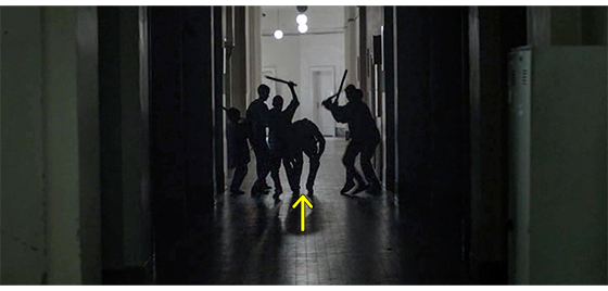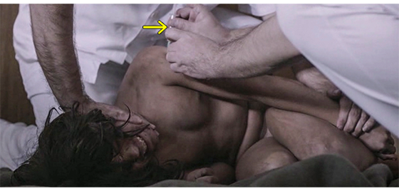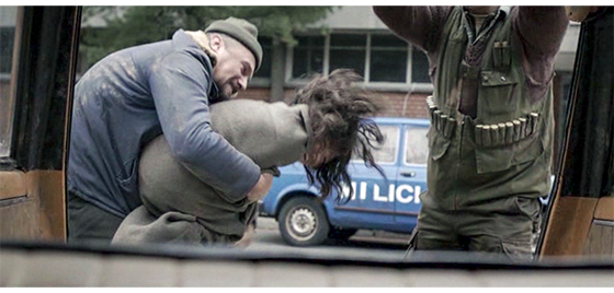 狩人のSUVがビルの前に乗りつけると〔左端〕、画面の左下に、「トラヴニク(Travnik、ベオグラードの約230km西南西)、ボスニア・ヘルツェゴビナ、1988年冬」と表示される(1枚目の写真)。先ほどの2番目の男が、暴れる少年をつかんで車から取り出すと(2枚目の写真)、建物の中に運んで行く。暗い部屋の床に置かれた少年の映像と共に、「近隣の自治体に問い合わせましたが、該当する子供はいませんでした」と、報告する声が聞こえる。床に横たわった少年のすぐそばに跪いた女性職員が、「可愛い子。怖がらないで。大丈夫よ」と言いながら手を伸ばすと、少年は その手に噛みつこうとする。すぐに、白衣の医療スタッフが2人寄って来ると、1人が後ろから少年の首と左手を押さえて動かなくし、もう1人が肩に全身麻酔薬を注射する(3枚目の写真、矢印)。