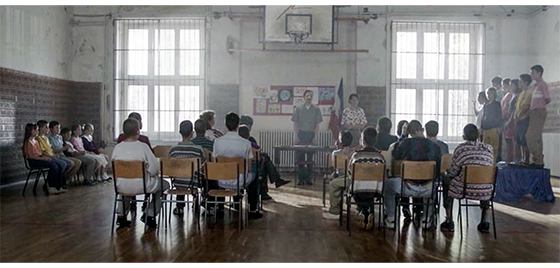 1992年の5月初め頃、施設内の小学校に生徒たちが集められ、「学校での学習を無事に修了した人に証明書を渡します」と告げられる(1枚目の写真)。そして、「プチュリツァ,ハリス」と呼ばれる。イルケは、前に出て来たプチケに 「こっちに来て。背筋を伸ばすんだ」と言うと、出席者全員に向かって、「今日は私たちの施設にとって素晴らしい日です。4年半前に私たちの施設にやって来て、それ以前は森で育ったハリス・プチュリツァ君が、私たちのコミュニティに加わり、小学校1年生を修了しました」(2枚目の写真)「彼は読み書きと会話を学びました。これからも努力を続け、成長していくことを願っています」と述べると、プチケと握手し、「おめでとう!」と褒め(3枚目の写真)、大きな拍手が起きる。