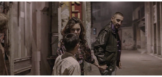 昼を過ぎた頃、目が覚めたプチケは、アパートのベランダから何となく外を見ていて、急にアリッサに会いたくなる。イルケの警告がしっかり頭に入っていなかったプチケは、悪意なく、アパートを抜け出してアリッサのいるナイトクラブに向かう〔最大の疑問は、「なぜ、イルケの母は止めなかったのだろう?」という点。朝食の時、彼女は、プチケを不快そうな顔で見ていたので、プチケをアパートに隠したまま一緒に住むのに耐えられなかったのがろうか?/いずれにせよ、このシーンは映画だけのものなので、何とでも解釈できる〕。プチケがナイトクラブに着いた時は、もう暗くなっていた。そして、アリッサが、売春婦として、男と一緒にクラブを出て行くところに、ちょうど間に合う(1枚目の写真)。アリッサは、「今はダメよ」と言って男と一緒に行こうとするが、プチケはアリッサの腕を引っ張って行かせない。それを見た男は、「このガキは何だ?! 家に帰って、ミルクでも飲んでやがれ! 失せろ!」と言って、プチケを突き飛ばす。怒ったプチケは、地面に落ちていた石を拾うと、背後から男の頭を石で殴って転倒させる(2枚目の写真)。翌朝、パトカーに乗せられたプチケは、警官2人に連行されて、施設に連れ戻される(3枚目の写真)【実話にはないアリッサと、これも実話にはないイルケの脱線的行為が一体化した場面。ない方がいいような気もするが…】。