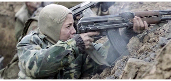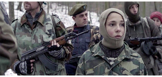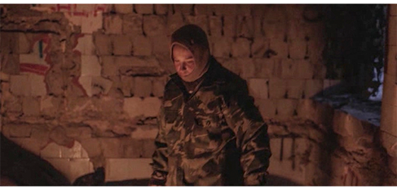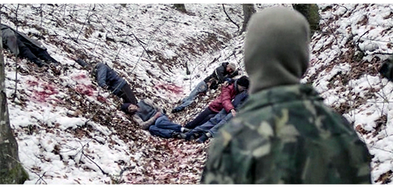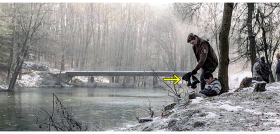 次のシーンでは、ジープから下りた小隊が川沿いで休憩し、ボスがプチケに戦闘用長靴を渡す(1枚目の写真、矢印)。プチケは、それまで履いていた運動靴を捨て、戦闘用長靴を履く。次のシーンでは、プチケが、それまで着ていた毛糸のセーターの上から軍服を着て、目だし帽をかぶり、小隊と一緒に歩いている(2枚目の写真)。プチケが見ているものは、放置された村人5人の銃殺死体(3枚目の写真)。
