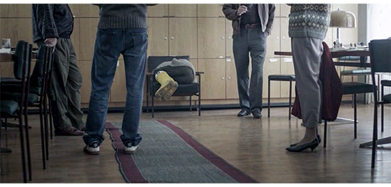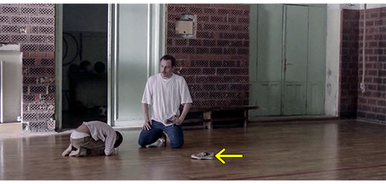 最初に集まった4人が相談する(1枚目の写真)。このシーンでの会話はたった一言。発言者はイルケ。「このままずっと閉じ込めておくことなんかできない」。ハリスは、服を着せられ、小さな体育館のような場所に連れて行かれ、イルケが嫌がるハリスに運動靴を履かせようとする(2枚目の写真、矢印)。しかし、何度やっても、手や足で靴を脱ぎ捨て、最後には丸くなる(3枚目の写真、矢印は靴、もう片方は、イルケが左手に持っている)。