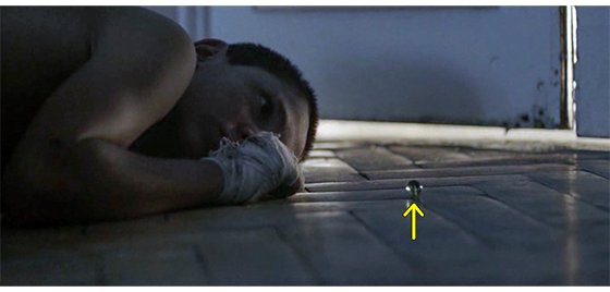 次のシーンでは、プチケが、内庭の建物の入隅〔壁と壁が出会うへこんでいる角〕で丸まってゴミをいじっている。そのプチケから5~6m離れた所に、さっきのジカがやって来て壁の前にしゃがみ込む(1枚目の写真)。プチケは、1個のビー玉を転がして遊び始める〔これで、プチケが部屋に閉じ込められた日に、ドアの下からビー玉を入れたのがジカだと分かる〕。プチケはビー玉の転がる音を聞くと、ビー玉をじっと見つめる。そして、少しずつジカに寄って行く。それを見たジカは、「プチケ、ほら」と言って、ビー玉をプチケの方に転がす(2枚目の写真、矢印)。プチケはビー玉を手にすると、元の入隅に戻り、ビー玉を見て楽しむ(3枚目の写真、矢印)。