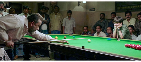 その時、部屋のガラスの向こうに、昔、“金曜の午後にプレーする許可証” を書いてくれたトゥトゥが見えた。親切なトゥトゥは、スヌーカーの部屋にミディを連れて行くと、ちょうどプレーをしていた会長に、直々に頼んでくれる。その時、プレーをしていたバーマンという男が、「その子は(小さ過ぎて)、テーブルにも届かないだろう」と言い、それを受けてか、会長は、「ここの水準は非常に高い」「プレーするには16歳以上でなければならない」と言い、受け付けてくれない。一旦家に戻ったミディは、父がクラブでお酒を飲んでいるという電話が入ったので、もう一度クラブに向かう。一方、クラブでは、酔っ払った父に、親切なトゥトゥが、先ほどの出来事を話し、競技大会に1人欠員があると教える。父は、さっそく会長の所に行き、「会長さん、もし1人欠員があるのなら、息子を遊ばせてやって下さい」(1枚目の写真)「1回戦で負けるでしょうが、彼を幸せにします」と頼む。それに対し、会長の横に座った生意気な男は、「トゥーシダス家は、いつも負けることが大好きとみえる」と言い、悪の権化のタンダンが笑い出す。そして、「16歳以上〔父のこと〕はダメだった。16歳未満〔ミディ〕に何ができる?」と言い、侮辱された父は、「何だと?!」とタンダンに向かっていくが、追い出される。腹の虫が収まらない父は、ミディが止めるのも聞かず、スヌーカーの部屋に行くと、2000ルピー〔6500円〕をクロスの上に投げ出し、勝負しようと言い出す。父が酔っていることを見た青服の男がOKし、最初に父が打つが、キューが手球にかすっただけ。その後もさんざんな出来なので、父は、「金は取っとけ」と言ってクラブから出て行く。そのことをミディから聞いたゴティは、ミディを連れてクラブに戻り、「おい、青シャツ、試合はまだ終わっちゃいない」と、いつもの強引な調子で文句を言う。青シャツが、「お父さんを連れて来い」と言うと、ゴティはミディを自分の前に出し、「彼がプレーする」と言う。相手が子供なので、青シャツはすぐにOKする。ミディの先攻で始まったプレーは、途中一度も交代することなく(2枚目の写真)、ミディの完勝に終わる(3枚目の写真)。途中から、部屋に入って来てプレーを見ていた会長は、その辣腕ぶりに感心し、自ら登録書にサインし(4枚目の写真)、「頑張れよ、坊や」と激励する。そして、青服は4000ルピーをゴティに渡す。