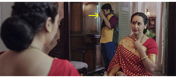 トゥーシダスはミディを抱き上げると、「来い、ジュニア。見せるものがある」と言うと(1枚目の写真)、優勝カップの前に連れて行き、「明日、誰が父さんに このトロフィーを渡すか知っとるか? お前だ」と言う。そのすぐ後、トゥーシダスはクラブの友人にバーに行こうと誘われる(2枚目の写真)。父の酒癖の悪さを承知している母は、今から夫婦揃って結婚式に出ないといけないからと反対するが、父は、①1杯飲むだけ、②先に家に帰って着替えて、③10分以内に戻る、と言って別れる。次のシーンは、トゥーシダスの自宅。母は、もう赤いサリーに着替えている。そして、恐らくイライラしながら父の帰りを待っていると、ゴティが戸棚を開けているのに気付く(3枚目の写真、矢印)。母は、すぐ立ち上がると、ゴティが棚から持ち出したお金を取り上げる。
