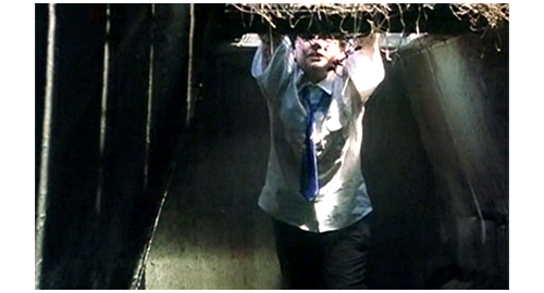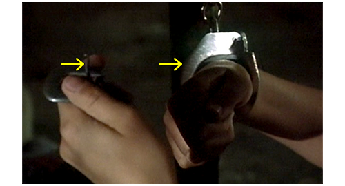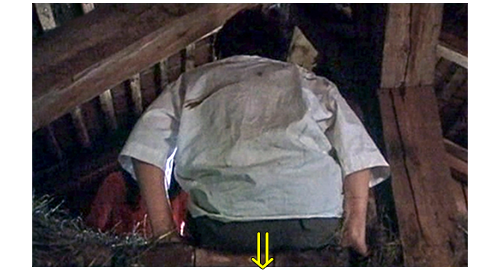 部屋に閉じ込められたリボルは、何とか手錠を外そうと考え、ベルトのバックルのピンを使って頑張る(1枚目の写真、左の矢印はピン、右の矢印は手錠)。運良く、手錠は外れ、リボルは手錠の部屋とつながった他の数部屋にも自由に行けるようになる。隣の部屋には汚水を流す原始的な装置があり、その先のパイプは、床の中に入っている。そして、そのすぐ横には、1m×1mほどの木の蓋がある。その先が、どうなっているのだろうかと、窓の外を見ると、短い丸太を通路のように並べた先に、四角い鉄の蓋が見える(2枚目の写真、矢印は鉄の蓋)。彼は、今いる部屋の木の蓋が、天井に丸太を並べた地下通路を経て、鉄の蓋に通じているに違いないと確信する(2枚目の写真の点線)。そこで、木の蓋の上に落ちている木片を拾い(3枚目の写真、リボルの背後に映っているのが、汚水を流す原始的な装置とパイプ)、蓋を開けると、思い切って中に飛び降りる。