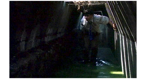 中には、10cmくらいの深さで汚水(糞尿、もしくは、尿)が貯まっていて凄まじい臭いだが、リボルは何としても逃げたいので、我慢して一歩一歩進む(1枚目の写真)。そして、終点にある重い鉄の蓋を、何度も試みて開けることに成功する(2枚目の写真)。しかし、鉄の蓋が、反対側に落ちた時に大きな音がしたので、家の中で眠っていた誘拐犯のうち、若者が目を覚ます。幸い、どこで何の音がしたのか分からないので、老人を起こしたりしているうちに、リボルは農家の中庭から その向こうの野原、そして、さらにその先の森に向かって走って行く(3枚目の写真)。
