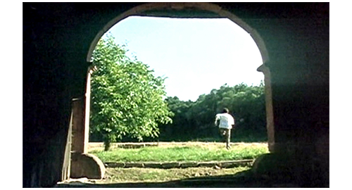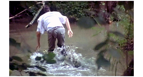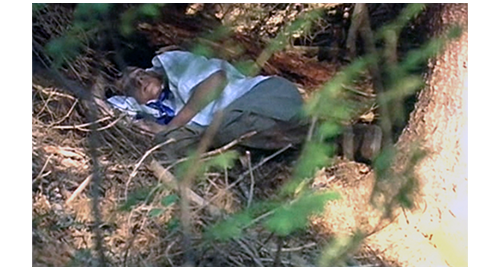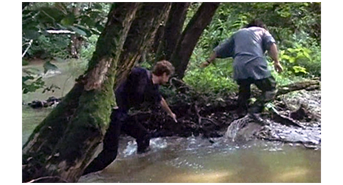 森に入ったリボルの最初のシーンは、渓流に入って対岸に行くところ(1枚目の写真)。このお陰で、汚水で汚れた靴と、ズボンの下部が洗われる。次に、誘拐犯2人が、リボル降りて行った四角い穴を見下ろす場面が入り、2人は農家から出て野原に出る。野原の左右を見てもリボルの姿がないので、正面に見える森に逃げたと思い、森に入り、リボルが渡った渓流に入って行く(2枚目の写真)。リボルは、藪の向こうから2人が追いかけて来たのを知ると、太い倒木の陰にぴったり寄り添って隠れ(3枚目の写真)、2人をやり過ごす。