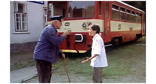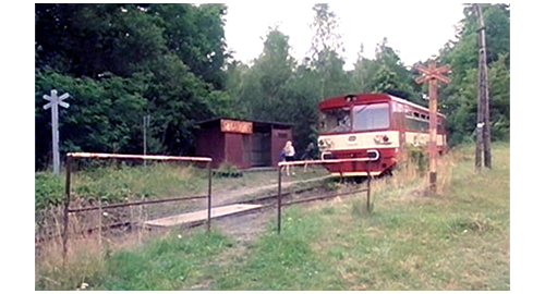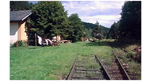 リボルが目を覚ますと、ディーゼルカーは停まっていて、車内には誰もおらず、なぜかリボルの靴と靴下がなくなり、裸足になっていた〔このシーン、理由はさっぱり分からない。①なぜ、運転手はリボルを残して下車したのか? ②なぜ、裸足なのか?〕。リボルがディーゼルカーのドアから外を覗くと、駅舎には「スカルスコ(Skalsko)」と掲示され、その前に山羊が1頭つながれている(1枚目の写真)。この駅舎は、プラハの中心から約45km東北東に実在する現役の駅舎で、2枚目に、Google street viewの写真を示す。駅舎の端に脚が見えたので、リボルは 「今日は!」と叫び、それでも反応がないので、もっと大きな声で「今日は!!」と叫ぶ。すると、老人〔駅員ではなく山羊の世話をしている〕が顔を出したので、「このディーゼルカー、次はどこに行くのか教えてもらえません?!」と、叫ぶように訊く。「どこにも行かん。ここが終点じゃ!」。リボルは、ディーゼルカーから下りると、老人の前まで行き、「ここに、電話ありますか?」と訊く。「線路づたいにセドリツェ〔架空の町〕まで行くがいい。そこに郵便局がある」と教える。そこで、リボルが教えられた方角に歩き始めると(3枚目の写真)、「今はちょうど昼休みじゃ」と老人が言ったので、リボルは老人の所に戻り、「できるだけ早く、電話まで行かないと」と助けを求める。すると老人は、「そうか。ならパネンコの家に行けばいい」と言う。「その家、どこにあるんです?」。老人は、さっきとは反対側を指して、「線路づたいに次の駅まで行くんじゃ」と教える。「だって、あなた、ここが終点だって言ったじゃない」(4枚目の写真)。「今は廃止になって、線路は撤去されたんじゃ」〔実際は、廃線にはなってない〕。