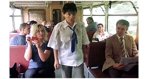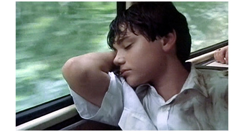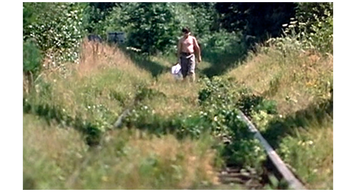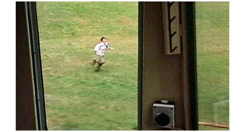 次の場面では、いきなり、1両だけの旧式のディーゼルカーが、ほとんど何もない駅の前に停まり、乗客が数名待っているのが映る(1枚目の写真)。この3名が乗ると、ディーゼルカーはすぐに発車する。すると、車両が動いて見えなくなると同時に、草の斜面を駆け下りて来るリボルが映る。リボルは、ゆっくりと走るディーゼルカーの運転手に向かって、全力で走りながら、「お願い、停まって!」と、何度も叫ぶ(2枚目の写真)。その姿を見た親切な運転手は、電車を停めてくれる。ここで、場面は農家に戻り、「くそっ、なんでだよ! 金も要求しとらんのに、こんなザマかよ」。「あのガキ、俺たちの顔 覚えるぞ。警察に行って通報する気だ」と言いながら、荷物をまとめてバンに入れて立ち去る〔これで、リボルが誘拐されたという “証拠” はなくなってしまう〕。ディーゼルカーに乗ったリボルは、自分が如何に汚いか知っているので、まず、一番後ろにある洗面所に行き(3枚目の写真)、固まったままの鼻血を洗ったり、ある程度服装を整えたりして、空いていた一番後ろの席に座るが、体やシャツやズボンに染み付いた臭いや、汚れが全面に付いた白いシャツに、前に座っていた男性は嫌な顔をする。しかし、そんなことにはお構いなく、疲れてリボルは、窓に腕と頭を乗せて眠ってしまう(4枚目の写真)。