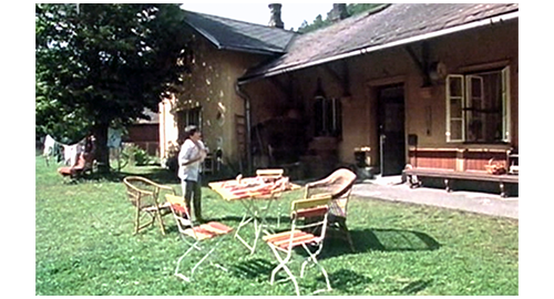 リボルは、暑いのでYシャツを脱ぎ、草の生えた線路の上を歩いて行く〔廃線なのは分かるが、レールが残っているので、「線路は撤去」の意味が分からない〕。しばらく歩くと目の前が開け、使われなくなった駅が見えてくる(2枚目の写真)。実は、このスドミェル駅は、先ほどのスカルスコ駅の北西1km〔線路沿いの距離〕にあり、現役の駅舎内にはスドミェル鉄道博物館(Železniční muzeum Sudoměř)もある。https://www.mladoboleslavsko.eu/dr-cs/16107-zeleznicni-muzeum-sudo mer.html というサイトにある 2枚目の写真とほぼ同じ場所から撮った写真を 3枚目に示す。線路は現役なので 草は生えていない。映画の撮影に当たり、廃線のように見せかけたと思われるが、列車は定時運行しているので、どうやって撮影したのだろう? リボルはYシャツを着ると、パネンコの家の前まで行き、「今日は!」と大きな声で呼びかける(4枚目の写真)。https://www.idnes.cz/cestovani/po-cesku/ muzea-vonici-parou-sudomer-u-mlade-boleslavi-dreziny.A221117_190804_po-cesku_vrja というサイトにある 4枚目の写真とほぼ同じ場所から撮った写真を 5枚目に示す〔現役の駅なので、先ほどのスカルスコ駅同様、紺色の板に白字で駅名(Sudoměř)が表示されている〕。