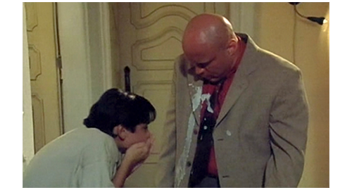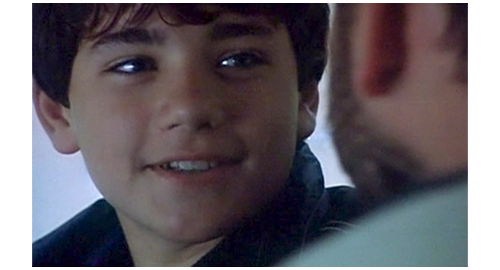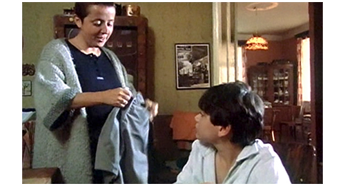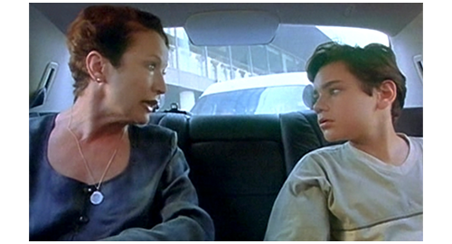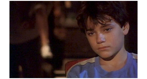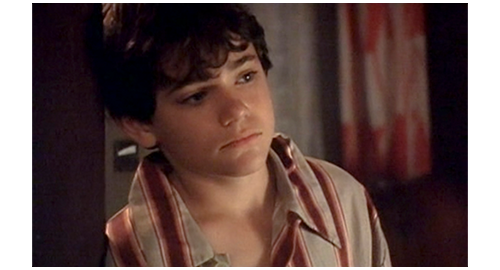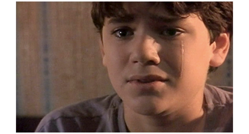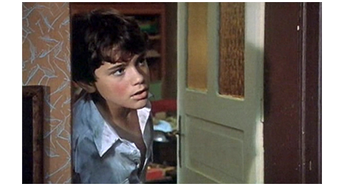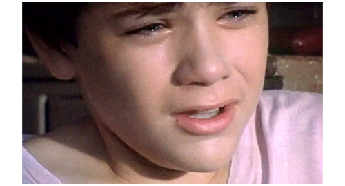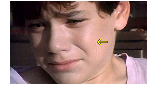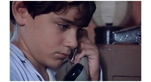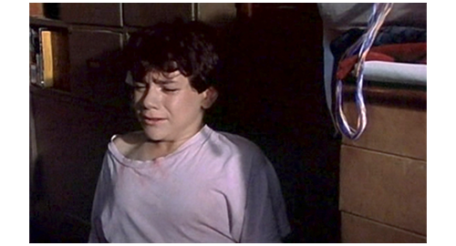 次の機会に、リボルが伯父のマンションに電話をかけると、今度は本人につながる。「リボル! 君は、一体何を考えてるんだ? どこにいる? 戯れ言(ざれごと)なんか聞きたくない。いいか、黙って私の言うことを聞け。私は君とのすべての関係を断った!」(1枚目の写真)「いいか。ちょっとした悪戯なら許してやった。だが、君が私たちから盗み、家出をし、さらには精神的に脅迫できると思い込んだことを、私は絶対に許さん。私は説明を待っている。本当で、真面目な、馬鹿げた作り話じゃない説明を!」。このひどい言葉の次に、今度は伯母が話す。「リボル、どこにいるの? 警察はあなたを指名手配のリストに載せたわ。家出したことだけではなく、ブレスレットのこともあるから。あなたは、私がそんなことはしないだろうと思ったかもしれない。でも、当然話すべきだったわね。あなたにまだ良心があるのか、私に分かるはずがないでしょ! こんな風に騙されるなんて思いもしなかったわ! これほど面倒見てあげたのに! リボル! リボル、聞いてるの? リボル、返事なさい!」。最後は、この2人の誹謗に対するリボルの怒り。「僕は、見つからないぞ! 絶対に! 隠れてやる! それに、僕は バカげたブレスレットなんか盗んでないぞ! あんた達なんか大嫌いだ!」(2・3枚目の写真、矢印は涙ではなく傷跡)。それだけ言うと、泣きながら、くず折れるように床に座り込み(4枚目の写真)、さらに泣き続ける〔これほど唾棄すべき夫婦は、映画の中でも見たことがない〕。