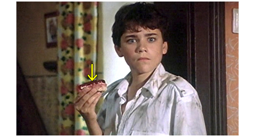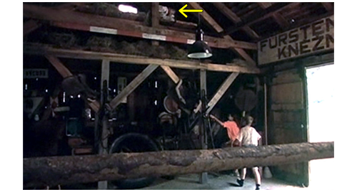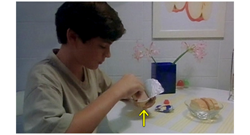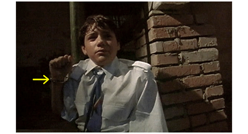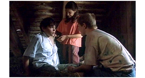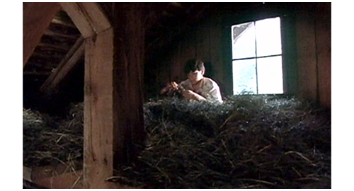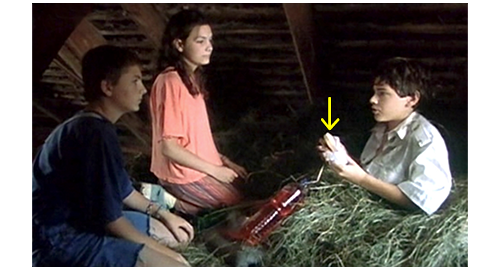 グスタにされてしまったリボルが納屋の2階の干し草の上に座っていると(1枚目の写真)、車のクラクションが聞こたので、すぐに窓から覗く。車種の特定はできなかったが、1960年のビュイック・ルセイバーに似たテールランプや、同じ年代のオースティンに似たヘッドライトから、相当古い車であることは確か。車が着くとフィリップとイトカが走って迎えに行き、運転席から男性が、助手席から女性が2人下りる(2枚目の写真)。次のシーンでは、2階に上がって来たフィリップが、干し草の山に向かって〔リボルは山の中にもぐっている〕、「グスタ」と呼びかける。「僕はグスタじゃない」。そう言うと、リボルが干し草を掻き分けて姿を見せる。すると、2階の縁に立ったフィリップが赤い液体の入った大きなペットボトルと、にんじん2本、イトカが紙で包んだサンドイッチを見せる。そして、「アイスクリームも持って来ようとしたんだけど、ブランカが冷凍バッグをちゃんと閉めなかったの」と話す。お腹が空いたリボルは、真っ先にサンドイッチを手に取ると、「ブランカって誰?」と訊く。「僕たちの母さんみたいな女(ひと)」。「『みたいな』って何だよ? だって、母さんて、いるか いないかのどっちかだろ?」(3枚目の写真、矢印)。そう言ってリボルがサンドイッチに噛みついた瞬間、イトカがリボルの腕を掴んでサンドイッチを口から引き離し、「黄疸があるのに、ソーセージ3本も食べていいの?」と訊く。リボルは、最初に噛みついた分のサンドイッチを噛みながら、「黄疸なんかないよ」と言って、サンドイッチを取り返す。そして、「君と、君の母さん、どうなってるの?」とフィリップに訊く。「ホント言うと、僕たちには母さんいないんだ。どんな女(ひと)だったかも知らない。ブランカとエリックが僕たちを孤児院から連れ出してくれたんだ」。窓から覗きながら、「あの赤毛の子も養子なの?」。「マルセラはホントの子。お医者さんは、ブランカに二度目の出産はダメだって。だから、ブランカとエリックはよく孤児院に行くんだ」。会話は長々と続くが、あと大事な部分は、会話の最後。リボル:「学校に行かなきゃいけないんじゃないの?」。イトカ:「私たちの体にはバクテリアがいっぱい。だから、どの親も、私たちが自分の子供に近寄らないよう必死なの」。フィリップ:「だから、学校に入れてくれないんだ。たとえ ひざまずいて懇願しても」。
