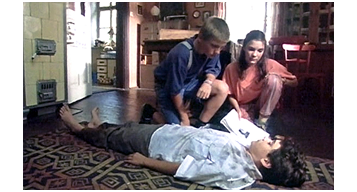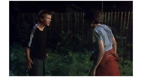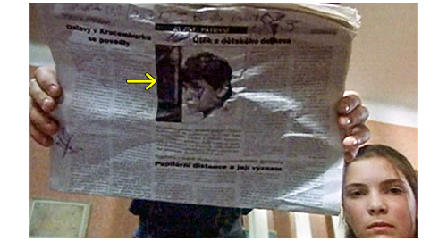 映画は暗転し、次に映像が写った時には、指が無理矢理リボルの目を開けている。そして、次の映像では、10代の女性(イトカ)の顔に、ピンボケから焦点が合う。リボルは、一旦気絶し、意識が戻ったように見える。すると、イトカが 「動いたら、頭を殴るわよ」と脅す。カメラが引くと、イトカの右隣に、リボルと同年か少しだけ年上の少年(イトカの弟のフィリップ)が写り、「こいつ、ここで何探してたんだろう?」と姉に訊く(1枚目の写真)。「お金でしょ? 他に何がある?」。リボルが、弱々しい声で、「僕、何かを盗むつもりなんか なかった」と言う。イトカは、床に落ちたお菓子を リボルの目の前まで持って行くと、「じゃあ、これ何なの?」と訊く。リボルが再び気を失うと、イトカは 「寝るんじゃないよ! どこから来たの? どうしてここに来たの?」と訊くが、反応はない。「強く殴り過ぎたんだよ、姉さん」。「あんたが殴りゃよかったんだ」。そして、さらに、「これって、あの子じゃない? ほら、ヴィソチナに行った時に読んだ」。フィリップは、さっそく新聞を持って来て、顔が載っている紙面をリボルに見せ、「これ、君だろ?」と訊く(2枚目の写真、矢印)。イトカ:「あんたよ。そうに決まってる」。そう言うと、新聞をフィリップから取り上げて、記事を読み上げる。「金曜日、チェスキー・ブジョルティの孤児院からツェルネ・スカラの療養所へバスで向かう途中、12歳のP. グスタは、誰にも気づかれずにバスから逃げ出した。友人や教師によると、グスタは重症肝炎に苦しんで “うつ状態” にあり、何度も自殺したいと口にしていたという。逃亡者は捜索中である」。そして、新聞をリボルの顔の横に持って行く(3枚目の写真)。この映像で、リボルがイトカに殴り倒され、床に倒れていたことが初めて分かる。記事の内容に同情したフィリップが、「グスタ、何とか、乗り越えないと」と言うと、リボルは 「僕はグスタじゃない」と反論するが、イトカは 「心配しないで。誰にも言わない。私たち、孤児院がどんなトコか知ってるから、グスタ」と慰める。「僕はグスタじゃない」。フィリップ:「ねえ、どうして肝炎だとうつ病で苦しむの?」。「知らないよ。肝炎になったことないから」。イトカ:「なったじゃないの。12歳で」。「僕、13歳だ」。フィリップ:「分ったよ、グスタ。詮索なんかしないから。僕たち、秘密を守り、君の情報は漏らさない。干し草置き場に隠してあげる。誰にも見つからないよ」。イトカ:「食べ物も、こっそり持って来てあげる」。フィリップ:「一つだけ約束しろよ、グスタ。自殺願望なんかクソくらえだぞ」。「僕はグスタじゃない」。