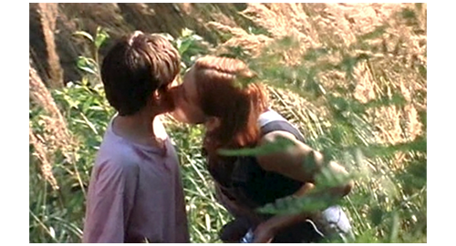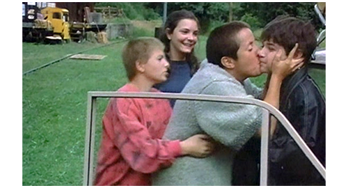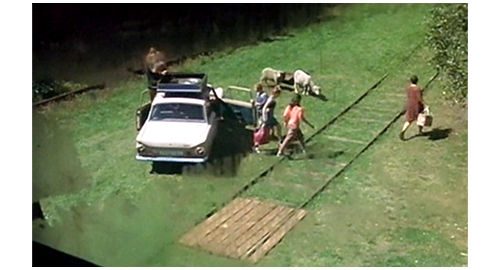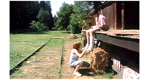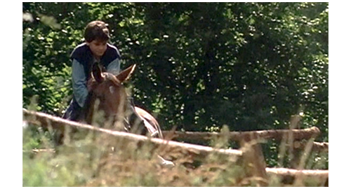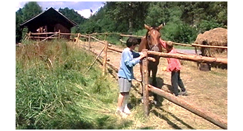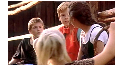そこからは、非常に短いシーンを並べて、リボルの幸せな生活が紹介される。最初は、子供達4人がレッドカラントの実で遊ぶシーン。まず、フィリップがイトカの頬を、レッドカラント・ゼリーを擦り付けて真っ赤にし、次に、イトカがリボルの頬に擦り付け(1枚目の写真)、その次は、マルセラがリボルの頬のレッドカラントを舐め(2枚目の写真)〔あるいはキスし〕、最後に、リボルがマルセラの頬にレッドカラントを付ける。2番目のシーンは、フィリップが長い棒を使って、ゆっくりと円を描いて歩ませる馬に、リボルが初心者らしく跨っている(3枚目の写真)。3番目のシーンは、家の前のレールの上を、フィリップとリボルが歩いて速さを競う(4枚目の写真)〔脚が悪いリボルは、バランスが悪くて遅れるが、ブランカを含めた女性3人は、リボルに声援を送る〕。