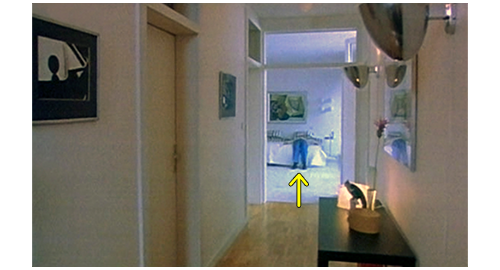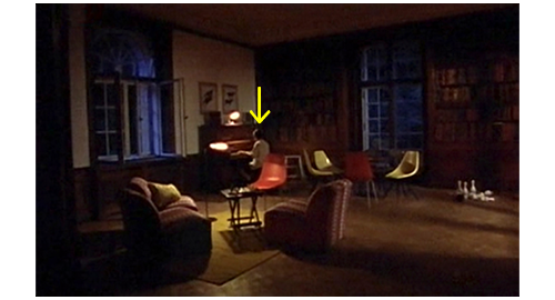 リボルが居間に入って行くと、伯父と伯母は、夫婦で来た顧客と恐らく家の設計について話し合っている最中だった。それでも、伯母は、「あら、早いのね」と言い、リボルは伯母の両方の頬にキスする。そして、伯父の前を通ると、彼は 「車はどうだった?」と訊き、リボルの 「よかった」で、両手をパチンと合わせる(1枚目の写真)。この仲良さそうなシーンだけ見ると、リボルが両親と会ったように見えてしまう。しかし、リボルが、「初めはスムースだったけど、プラハに入ると、亀みたいにゆっくりで…」と話し始めると、伯母が、「座ってて。今、打ち合わせ中なの、すぐ終わるわ」と言う。リボルは、奥の丸イスに乗っていた黒猫のザラを抱き、丸イスに座る。リボルはすぐにザラの異常に気付き、ダニがいるに違いないと、ザラをひっくり返して調べる。その度にザラがニャーと鳴き、打ち合わせの邪魔になると、伯母が嫌な顔をして何度もリボルを見る。リボルは、遂にダニを見つけ、伯母の前までザラを抱いていくと、「見て、豆粒くらいのダニだよ」と言って、ダニを見せる。伯母は 「分ったから、すぐ捨てなさい!」と叱り付けるように命じる(2枚目の写真、矢印はザラとダニ)〔「何て不衛生な家か」と思われるのを嫌った〕。リボルは、猫を抱いたままキッチンに行き、夕食に何か食べようと、小さなテーブルの上のパンを見るが塗る物がない。冷蔵庫を開けるが、中には小さなビン1本、小さな缶詰1個、皿の上にごく小さな球状のもの3個の3つがあるだけ。リボルは、缶詰を取り出すと、猫の絵が描いてある。ザラの餌だと思い、床に置いてあるザラ用の皿に少し入れるが、お腹が減っているので、缶の裏の原材料を読む。「牛肉、ゼラチン、動物性脂肪、ビタミンB、C、D、E、β-カロテン、タンパク質、カルシウム、天然フレーバー」。これなら人間が食べても大丈夫と思ったリボルは、パンを缶の中に突っ込むと(3枚目の写真、矢印は缶)、パリパリと食べる。それから、自分の部屋に行くと、「世界の創造主(Stvořitel svĕta)」というコンピュータ・ゲームを立ち上げ(4枚目の写真、矢印)、野原、木、動物、家を作っていき、完成した風景をプリントアウトし、「こんな家に住んでみたいな」とザラに話しかける。初めて週末に帰宅したというのに、金曜の夜遅くまで仕事で無視され、放っておかれるとは、何と冷たい伯父と伯母なのだろう。