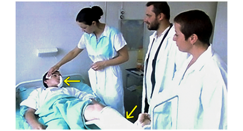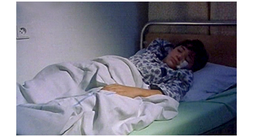 リボルが意識を取り戻すと、病院の看護婦が 「目を覚ましました」と、エリックとブランカに知らせる。2人はベッドに寄っていき、エリックが 「やあ、グスタ。エリックだ」と声をかけ、ブランカも 「ブランカよ」と声をかける。看護婦は、「頬の傷はそれほど深くありません。数日で治ります。でも、肩の打撲と足の骨折は治るのに時間がかかります」と説明する(1枚目の写真、矢印は左頬の傷と、左脚のギブス)〔頬の傷自体は治っても、傷の痕はギブスが取れた後まで残る〕。そこに、グスタの資料を手に持った白衣を着た警官がやって来て、「名前を言いなさい」と声をかけるが、リボルは頬の傷のため声が出ない。そこで、警官は、資料を見ながらエリックに向かって、「ペシェク・グスタ、1989年11月3日生まれです。彼は、3週間以上前に孤児院から逃げ出しました。我々は、彼を見つけられるとは思っていませんでした。身元確認のため 証人が一人必要です。サインして下さい」と言って書類とペンを渡す。エリックは、書類にサインする(2枚目の写真)。エリックは、孤児院の住所と電話を訊く。ブランカは、リボルの近く行き、右手を彼の頭の下に入れて頭を持ち上げて額にキスしようとする。すると、リボルは再び気を失い、さっきまでとは全く違う夢を見る〔その中で、スドミェル駅の前を走って行く列車に乗っている夢を見る ⇒ レールは駅の紹介をした節の時に使ったネットの写真と同じように整備されていて、草など生えていない〕。リボルが目を覚ますと、ブランカの笑顔がすぐ目の前に迫り〔白衣を着ていないので、別の日〕、「今日は、グスタ。覚えてる? 私 ブランカよ」と声をかける(3枚目の写真)。リボルは、小さな声で、「初めまして」と丁寧に挨拶する。ブランカは、リボルと握手しながら、後ろに座った3人の子に向かって、「まあ! 『初めまして』なんて、突然、礼儀正しくなったのね」と言う。そして、「気分はどう?」とリボルに訊きながら、以前フィリップが持って来た “赤い液体の入った大きなペットボトル” をイトカから受け取ると、「これは 自家製のレッドカラント〔赤すぐり〕ジュースよ。飲めば飲むほど、早く良くなるわ」と説明する。