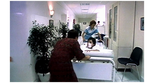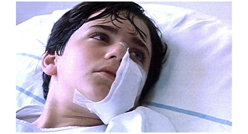 すると、そこにいきなり看護婦が入って来ると、リボルのベッドを引っ張って部屋から出そうとする。何の説明もないので、びっくりしたブランカが、「どこに連れて行くんですか?」と訊くと、「感染症病棟へ。猩紅熱です」と言う〔5~15歳の子供に多く見られる感染症(高熱、咽頭痛、体全体に広がる紅色の発疹)/飛沫感染か接触感染だが、どこで感染したのだろう?(対象者がいない)/抗菌薬の投与で、数日〜1週間程度で症状は改善する〕。そして、看護婦がベッドの足側を引っ張り、ブランカがベッドの頭側を押して、廊下を感染症病棟へと向かう(1枚目の写真)。ブランカは、「怖がらないで。ここに長くは置いておかないから」と安心させようとする。ブランカの横に来て、一緒にベッドを押し始めたフィリップは、「家にベッドを用意したよ。それとも、孤児院に戻りたい? あんな狂った所に戻りたくないだろ、グスタ?」と話しかける。リボルは、「僕、戻りたくない。一緒にいさせてくれたら すごく嬉しい。少しの間でも!」と叫ぶように言って、病棟の2人部屋に入れられる(2枚目の写真)〔飛沫感染する病気なのに、こんなに大声で話させて 病院は平気なのだろうか?〕。次のシーンでは、もう1つのベッドの患者が、ベッドに腰かけて携帯電話で長々と話している。そして、ベッドに携帯電話を置いて部屋から出て行ってしまう。リボルは、さっそくベッドから出ると、携帯電話を使って寄宿学校内の “生徒用の公衆電話” に電話する。近くにいた生徒が受話器を取ったので、リボルは、同室のドミニクに代ってもらう。ドミニクが電話に出ると、リボルは、「何がどうなってるか知りたいんだ」「伯父さんはどう?」「彼、何て言った?」「何だって? 僕のナイトテーブル調べた? 他には?」(2枚目の写真)「警察は? 来たの?」と訊く〔ドミニクが何と答えたのかは分からない〕。ここで、カメラはドミニクに切り替わる。「今度で2回目だ」「心配するなよ、何も言わないから。そもそも、僕は何も知らないし」。そして、会話は、警官がドミニクに質問に来たことで停止される。この一方的な会話からは、何が話されたか全く分からないが、後でリボルがかけた電話からすると、“リボルはブレスレットを盗んで家出した” と誤解されていることは、教えてもらったらしい。