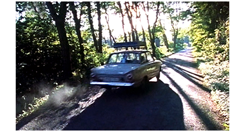 月曜の朝、学校に連れて行く車の前で、伯父はリボルに、「持ってなさい」と言ってお札を1枚渡そうとする。リボルは、「そんなにたくさん要りません」と言うが、伯父は 「夏休みまで2週間ある。取っておくんだ」と勧めたので(1枚目の写真)、リボルは 「ありがとう」と言って、もらったお札をズボンのポケットに入れる。それを見た伯母は、さっそく、「お財布はないの?」と問いただす。「ザラが財布で遊んでた。テラスのどこかにザラが埋めたんだと思うけど」。「まさか、犬じゃあるまいし」。「うん、そうだね」。伯母は、リボルがチャックの壊れたズボンを履いているのを見て、「新しいのはどうしたの?」と訊き、洗濯中だと訊くと、「よくまあ、そんなに早く汚せるわね」と嫌味を言うが、伯父は、「行きなさい」と、リボルを解放する。リボルが、「行ってきます」と言って、すぐ目の前に停まっているサーブの助手席まで歩いて行き、ドアを開ける前に手を振ろうとすると、2人はとっくにいなくなり、玄関に入る寸前だった〔そのくらい、リボルのことを、“お邪魔虫” だとしか思っていない〕。サーブが角をまがって消えると、青色バンがすぐ後を追って行く(2枚目の写真、矢印)。途中で、マデラは給油のためにガソリンスタンドに寄るが、リボルが 「トイレに行くのを忘れてた」と言って、車を降りる(3枚目の写真)。リボルが、トイレで小便をしていると、ドアが開く音がして足音が聞こえ、すぐ横と後ろまで来ると立ち止まったまま動かないので緊張する(4枚目の写真)。