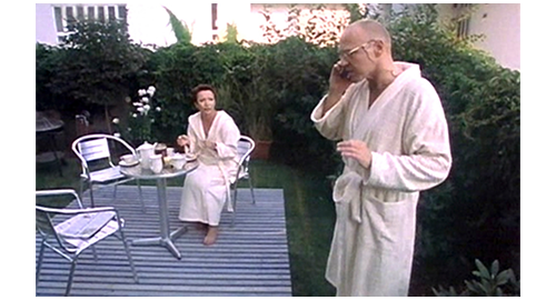 猩紅熱で他人を感染させる恐れがなくなった段階で〔左の頬の傷も、ガーゼは不要となった〕、リボルはおんぼろ車で、パネンコ家に向かう(1枚目の写真)。家に着いた時のシーンはなく、次のシーンでは、リボルが、ブランカが外で庭仕事をしているのを見て(2枚目の写真)、こっそりと電話機のところまで行き、伯父のマンションまで直接電話をかける(3枚目の写真)。しかし、出たのは留守録の声だったので、「僕だよ。僕、家出なんかしてないから電話したんだ。僕、悪いことなんか何もしてない。ブレスレットのことだって何も知らない。あの時、ガソリンスタンドでトイレに行ったら、彼らが…」。その時、ブランカが家の中に戻って来た音がしたので、リボルは急いで受話器を置き、片足ギブスで歩ける最大速度で隣の部屋の長椅子に座る。間に合って、部屋に入って来たブランカは、何も疑わず、「ディルスープ〔ディル・ピクルス(きゅうりをディルというハーブとスパイスで香りづけして漬け込んだ洋風のピクルス)の風味がたっぷりのベーコンとポテトのスープ〕食べる?」と訊く。そして、「何が嫌い?」とも。「カリフラワー」。そこに、イトカが、イボガエルを持ってやって来ると、「手で取る? それともグラスに入れようか?」と訊く。そんな気持ちの悪いもの触るのも嫌なので、ダブダブの厚手のシャツで受け取ると、床に落とす。イトカが、また変なものを持って来ると困るので、「カエルもダメだからね」と予防線を張る。「ネズミはどう? 試したら?」。一連の話を聞いたブランカは、「馬、猫、犬、鳥、ハリネズミ〔可愛いので人気のあるペット〕は飼ってもいいわ。ネズミ、カエル、ヘビはダメ。分かった?」と常識的なことを言ってくれる〔それが規則なら、2年もここで暮らしたイトカが勧めたのだろう?〕。