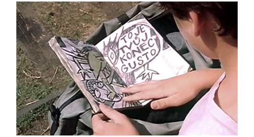 翌日、家の外にバッグを持ち出したリボルは、壇の上に腰かけて中を見てみる。一番下には、グスタの日記が入っていた。そこには、院長がグスタに向かって命じている絵図が、台詞付きで描いてある。最初の絵では、「もうシーツを3枚もオシッコで汚したから、罰としてオムツで寝なさい!」。次の絵では、院長がたくさんの靴を指して、「夜までに鏡のようにピカピカになさい!」。3つ目の絵には、「排便するには遅過ぎるし体に悪いから、夕食など食べずに寝なさい!」〔如何にひどい孤児院だったかが分かる〕。そして、最後の絵には、これまでとは逆に、グスタが院長に向かって、「お前は終わりだ」と怒鳴る姿が描かれている(1枚目の写真) 。すると、後ろから忍び足で近づいたマルセラが、上から小石を落としたので、リボルは日記を閉じる。マルセラは、「そのノート、何が書いてあるの?」と訊きながら、壇から地面に飛び降りる。「秘密だよ」。「誰の?」。「1人の子の。彼は、戻って来るまで、このノートを置いて行ったんだ」。「彼、どこに行ったの?」。「言わないよ」。「彼、いつ戻ってくるの?」。「彼が戻ったら、僕は出て行くんだ」(2枚目の写真)。リボルは話題を変えたくなったので、マルセラが壇の上に残していった本を見て、「何 読んでるの?」と訊く。「犬について。犬が、どう行動し、如何に賢いか」。「猫も賢いよ。特に、ロシアンブルー、僕の猫は」(3枚目の写真、マルセラはリボルのギブスに落書きをしている)。「あんたの猫? 孤児院で猫が持てるの?」。「うん」。「どうして犬が嫌いなの?」。「嫌いだなんて言ってないよ。僕、犬がずっと欲しかったんだ。小さい頃、飼っててね、Pan〔チェコ語では食べるパンではなく、ミスターという意味〕って名だった」。